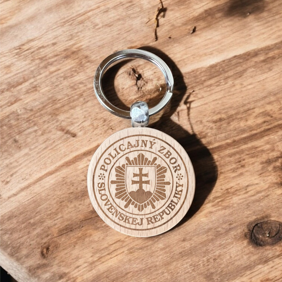Drevený prívesok v tvare kruhu s gravírovaním logom policajného zboru.