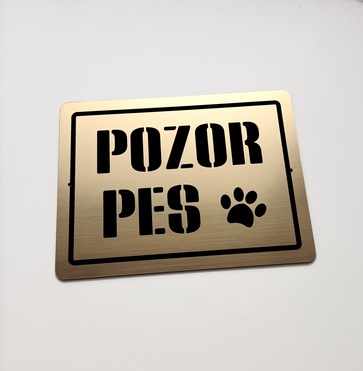 Obľúbená tabuľka s textom "POZOR PES" vhodná na plot.